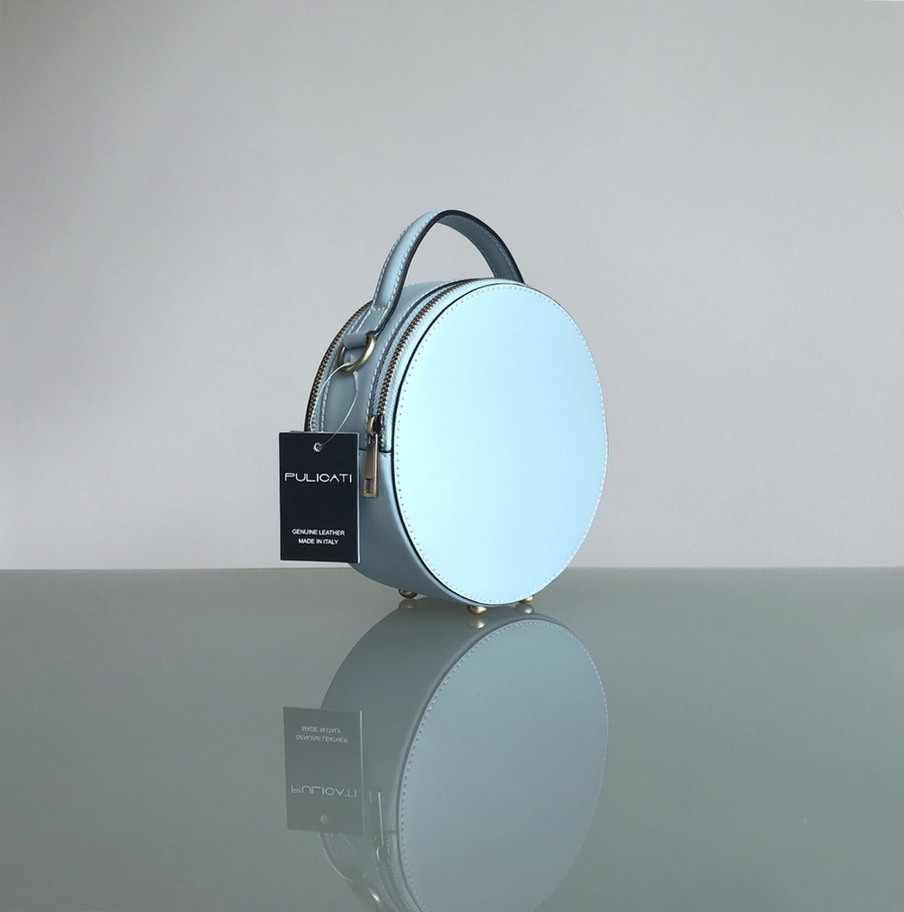 Trendige Circle Bag in den Farben hellblau und camel von Pulicati.