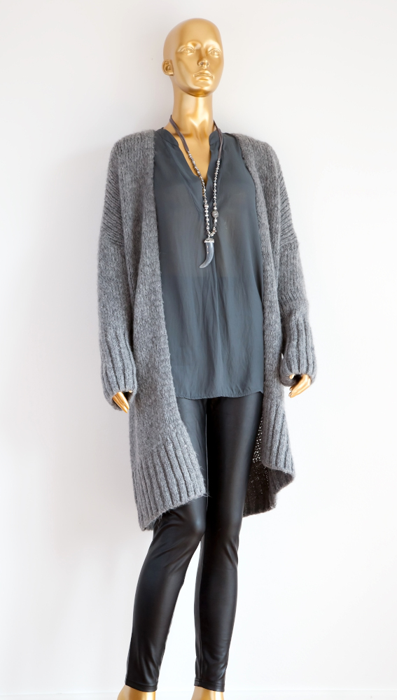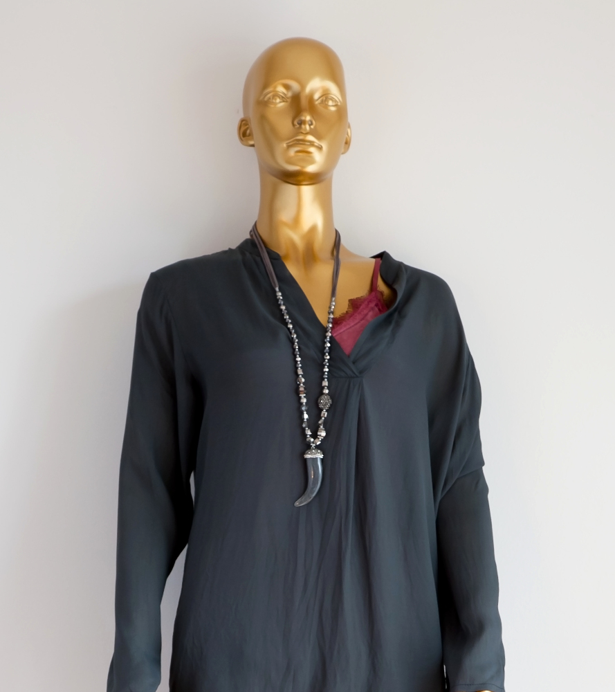 Trendige, lange Kette mit angesagter Raubtierzahnnachbildung in schönen Grautönen. Passend zu fließenden Blusen, Cardigans etc.