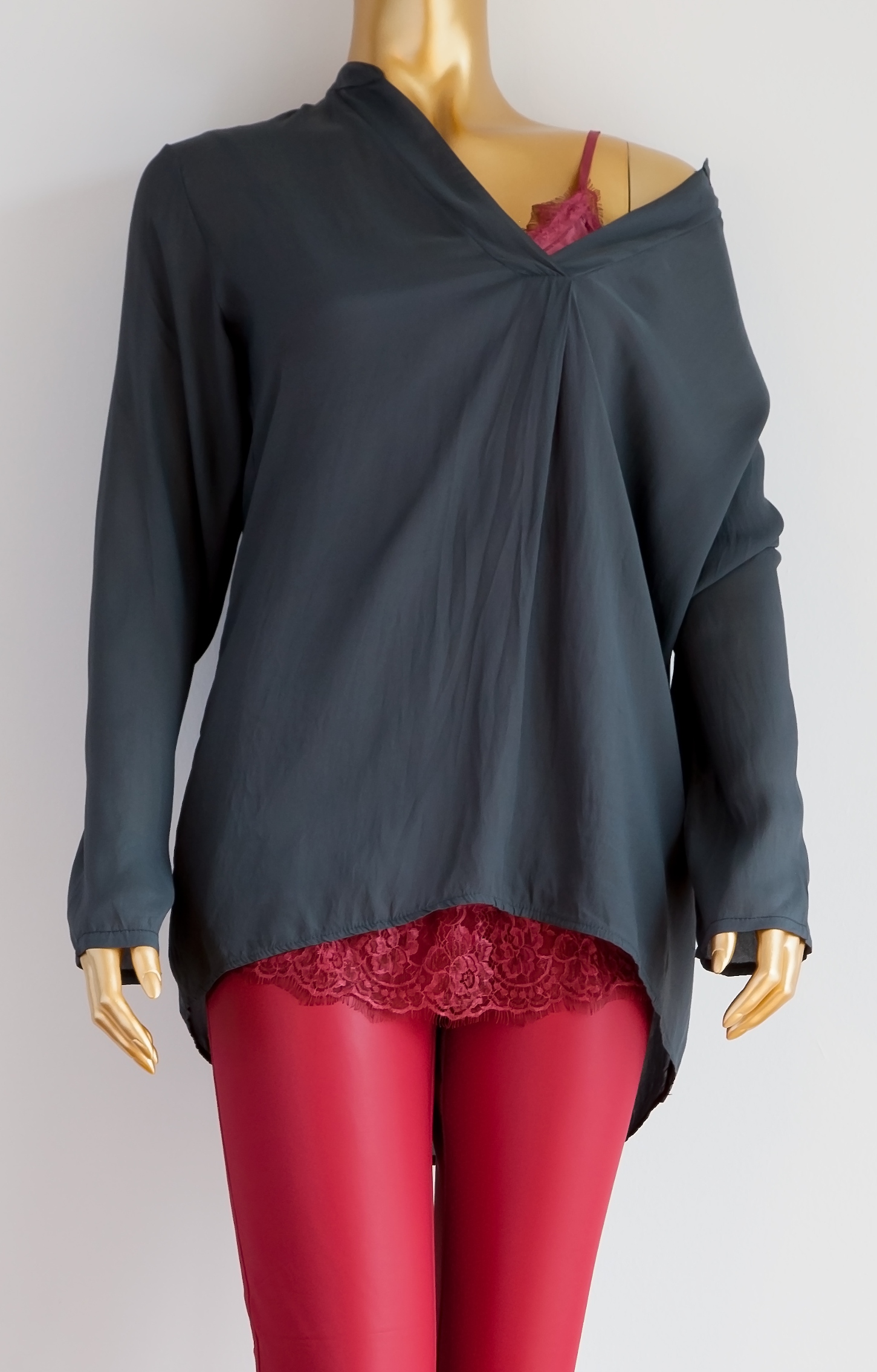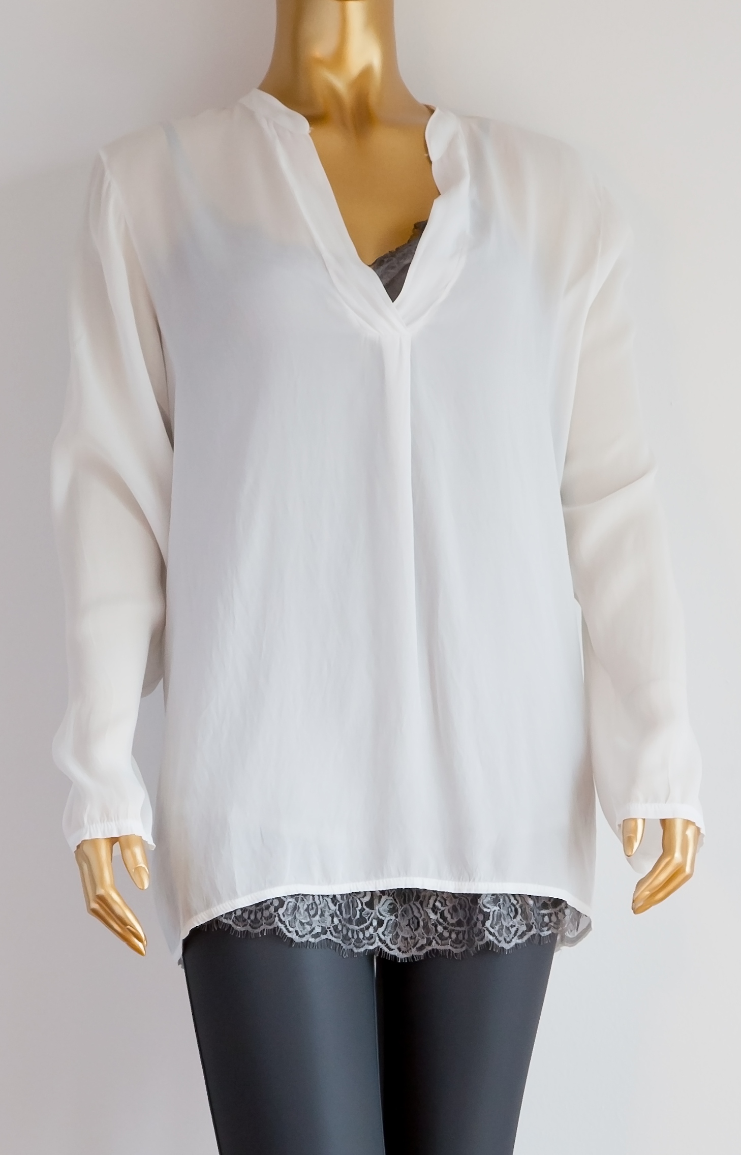 Elegante und leichte Bluse von V Milano in wollweiß und dunkelgrau aus 70% Viskose und 30 % Seide.